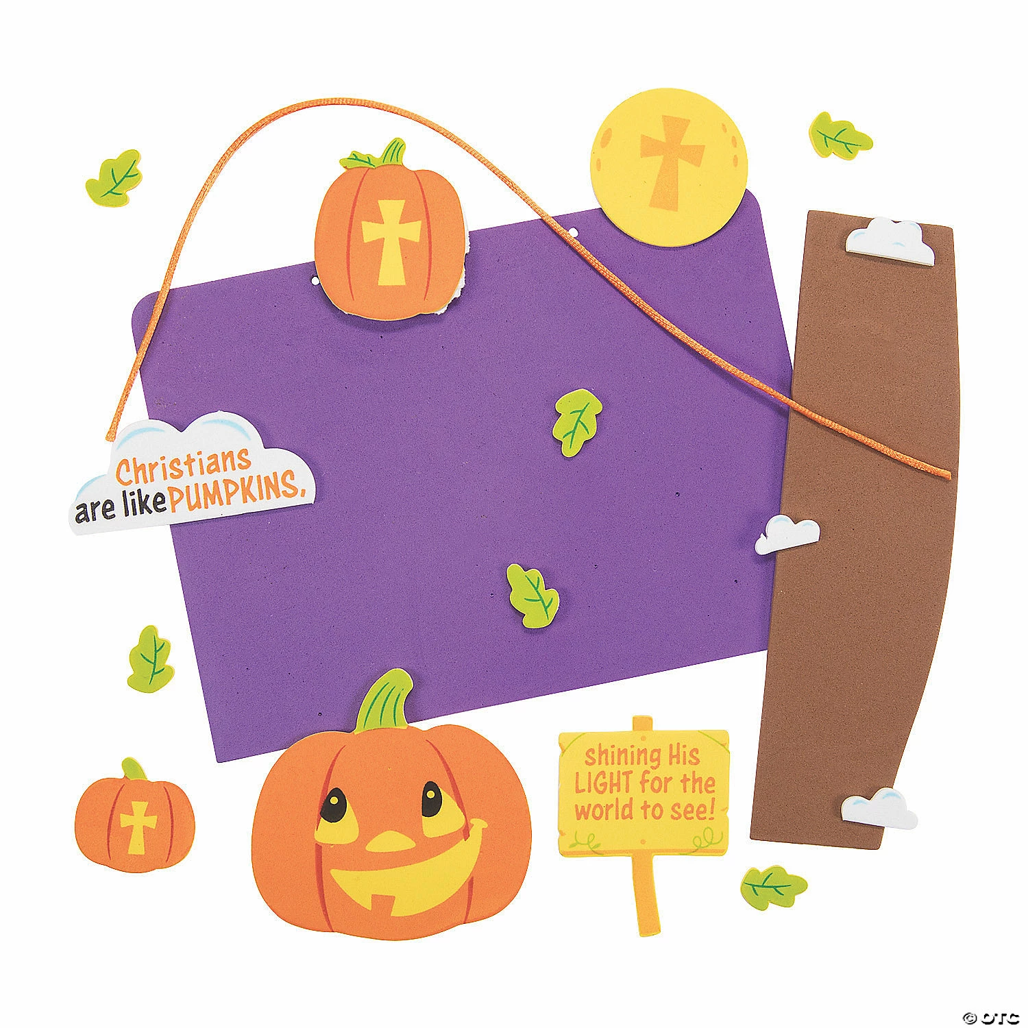 This inspirational Halloween craft for kids is perfect for Sunday Schools or church groups. The completed sign says “Christians are like pumpkins, shining His light for the world to see!” It will make a great addition to home dรฉcor when they’re done! Includes self-adhesive foam pieces and satin cording. 7 1/2″ x 5 1/2″ All craft kit pieces are pre-packaged for individual use. Kits include instructions. Makes 12. ยฉ OTC