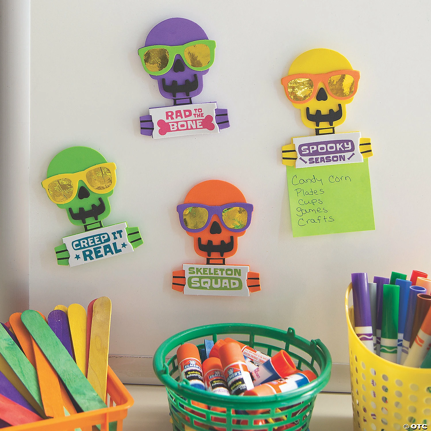 No shade, but these sunglasses-wearing skull Halloween magnet craft activities are rad to the bone and plan to stick around the joint a while. Kids can create their skeleton magnet projects at the class Halloween party, then take them home as a Halloween decoration party favor, or as an art supply to hang up their other Halloween art. Includes self-adhesive foam pieces and foil stickers. 3 1/4″ x 4 1/4″ Makes 12. All craft kit pieces are pre-packaged for individual use. Magnets are packaged separately. Do not discard. Kits include instructions. © OTC